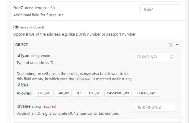 ch_doc_partners[ 1 ]-ids = address_ids.For a list a valid ID types, look at https://trade-compliance.docs.developers.aeb.com/reference/screenaddresses-1